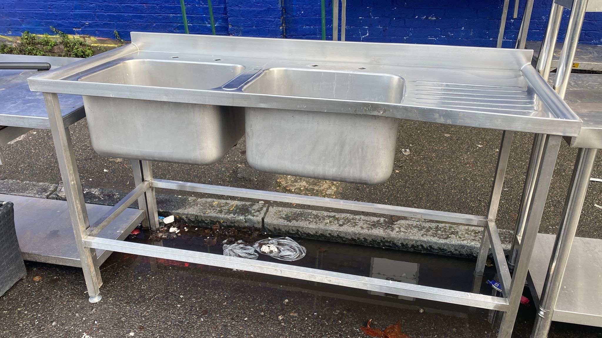 Double bowl stainless steel industrial kitchen sink in good condition as shown in images