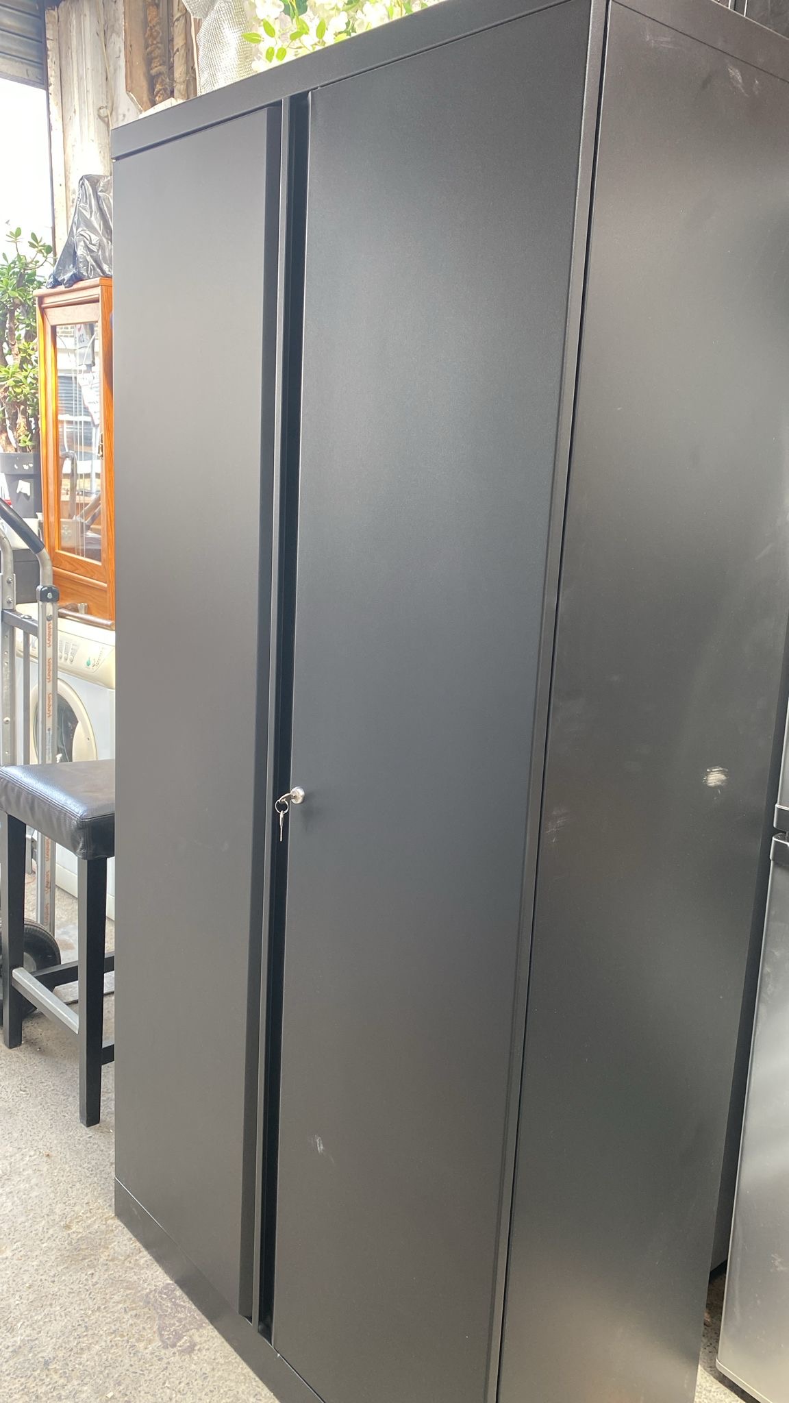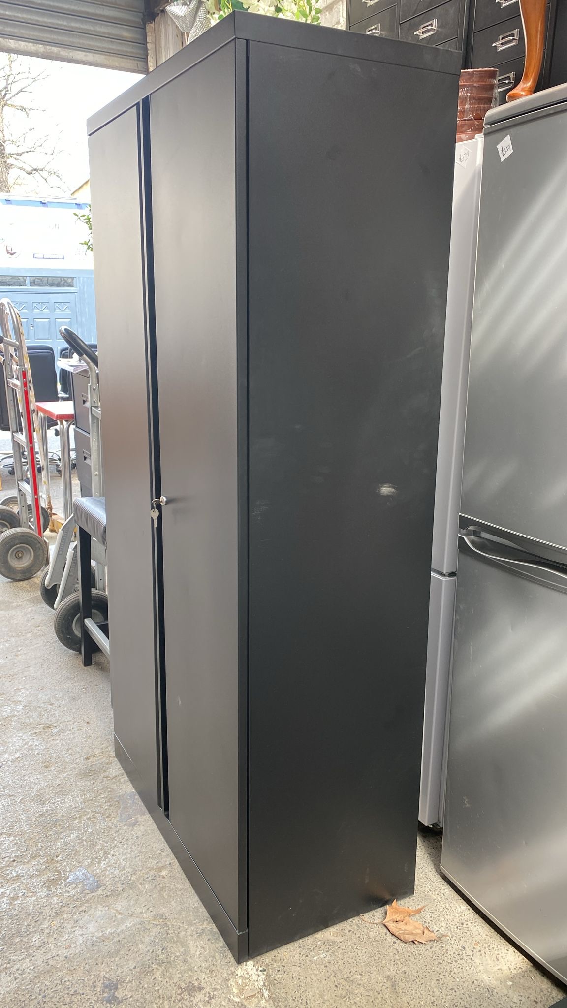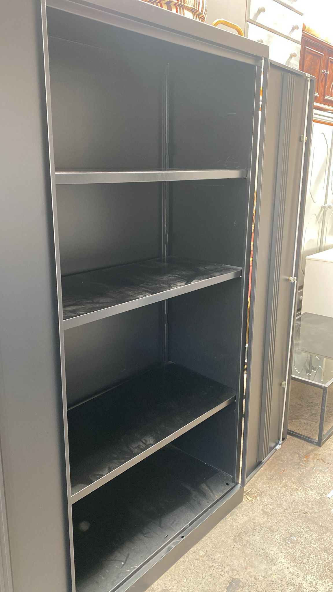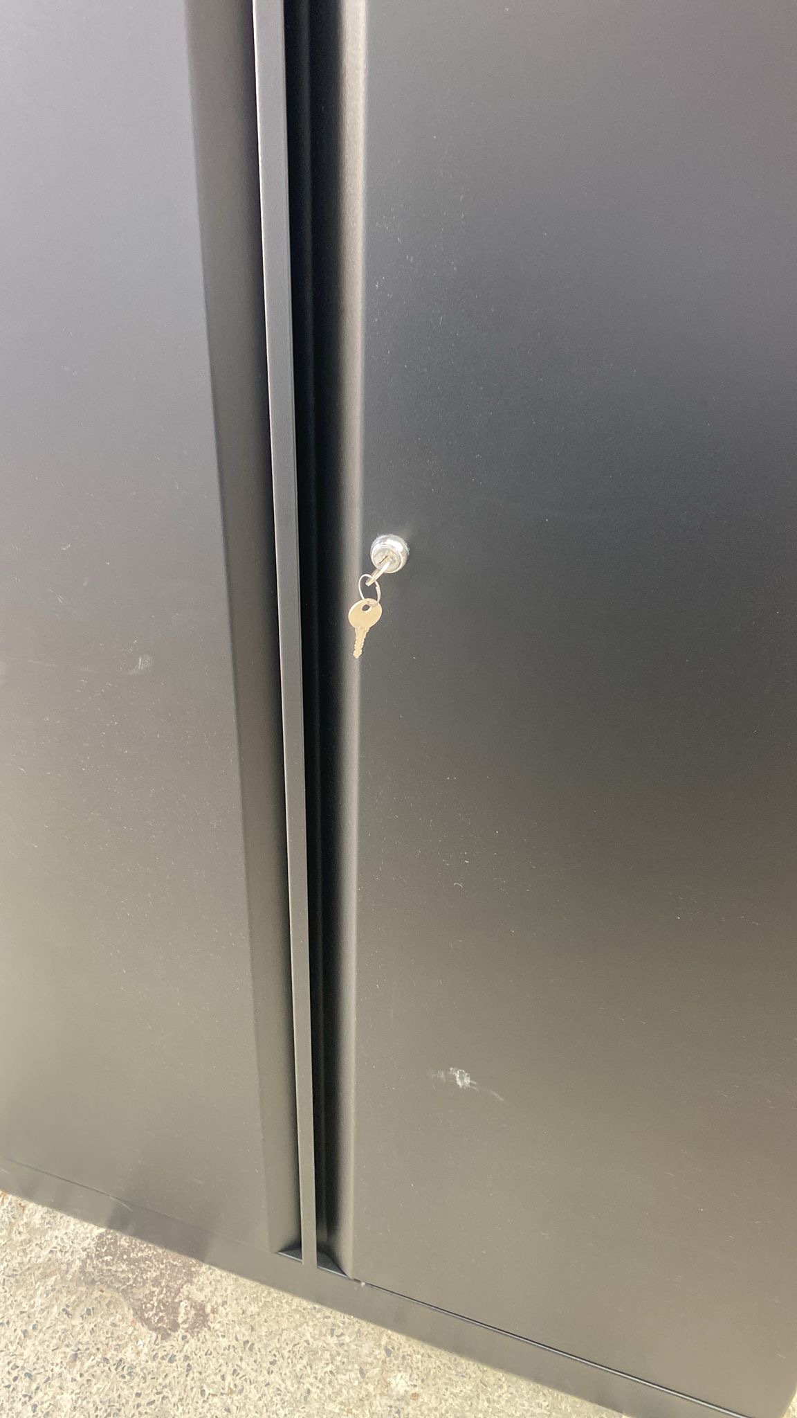 Lockable stationary cabinet with three moveable shelves and a key as seen in images